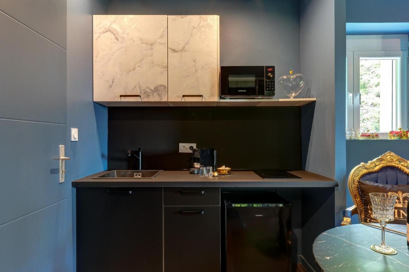 Appartement 1 Chambre. This apartments special features are the hot tub and the spa bath. The well-equipped kitchen features a stovetop, a refrigerator, kitchenware and a microwave. This air-conditioned apartment comprises a dining area, a flat-screen TV with streaming services a washing machine and a coffee machine. The unit offers 1 bed.