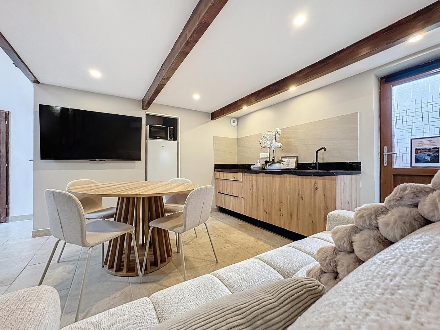 Maison 1 Chambre. Boasting a private entrance, this air-conditioned holiday home features 1 living room, 1 separate bedroom and 1 bathroom with a shower and a hairdryer. In the kitchen, guests will find a stovetop, a refrigerator, kitchenware and a microwave. The holiday home features an electric kettle, a sofa, heating, as well as a flat-screen TV. The unit has 2 beds.
